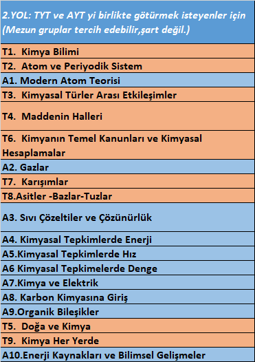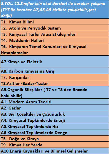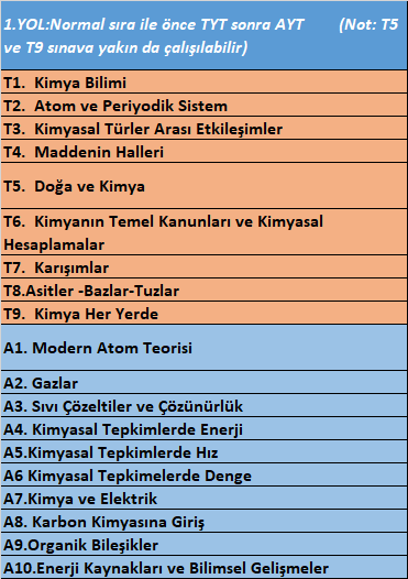 Özellikle belirtmeliyiz ki çalışırken izleyeceğiniz bu yollardan herhangi biri İçin 'şu doğru ve senin başarını kesinlikle artırır' şeklinde bir çıkarımda bulunmak yanlış olur.Yani çalışma sıran direk başarını etkilyecektir diyemeyiz.Ama şuna da dikkat etmeniz gerek, özellikle AYT konularına başlamadan önce temel kavramlarda (T1,T2,T3) eksiklerin varsa mutlaka onları gidermelisin.Örneğin mol ve hesaplama ünitesini bitirdikten sonra AYT de Gazlar ve sonrasına başlamalısın.Karbon kimyası ve Organik Bileşiklere çalışabilmen için TYT nin yine ilk 4 ünitesini ve hesaplamalar ünitesine çalışman gerek.Lisede kimya temelini iyi oluşturduysan tabiki bu sıralamada kendine göre esneklik sağlayabilirsin.Unutma,kimyada sırf ezber ve sadece formüle dayalı bir çalışma sistemiyle ilerlemen günü kurtarmadan başka bir işe yaramayacaktır. Ana hedefin çok soru çözmek birden fazla soru bankası bitirmek değil, sağlam bir konu hakimiyeti ve sorular üzerinden sıklıkla tekrar olmalıdır...